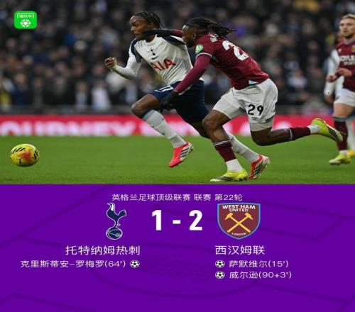 北京时间1月17日,英格兰足球超级联赛第22轮展开较量,托特纳姆热刺坐镇主场迎战西汉姆联。比赛中,西汉姆联率先打破僵局,萨默维尔接马特乌斯-费尔南德斯助攻后成功破门。此后,托特纳姆热刺展开反击,波罗送出精准传球,克里斯蒂安-罗梅罗抓住机会扳平比分。临近结束,西汉姆联由威尔逊在补时阶段攻入关键一球,完成制胜。最终,全场比分定格为托特纳姆热刺1-2西汉姆联。