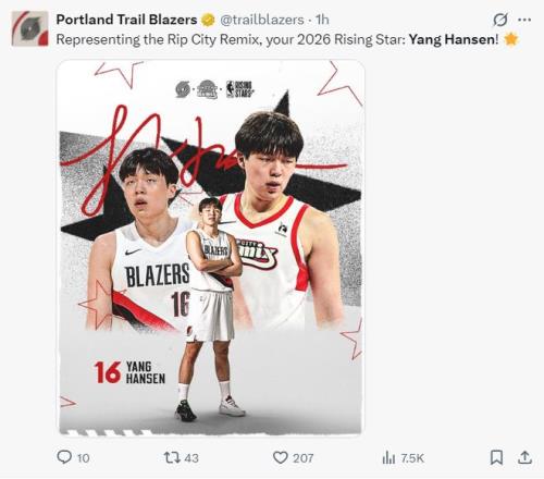 开拓者官方在赛前祝贺球队新秀中锋杨瀚森入选2026年NBA新秀赛。