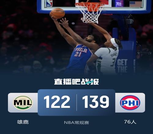 比赛开始,76人连续三分打出9-2开局,但特纳里突外投连得10分强势回应,双方展开拉锯战,恩比德连续杀内线单节砍下18分,76人领先8分,次节雄鹿接连三分追到差3分,但76人迅速回应10-0稳住局势,双方你来我往半场76人还领先9分。下半场,乔治里突外投连砍10分,但库兹马也能连续杀伤强势给出回应并带队一度追到差1分,好在马克西和乔治又接连三分稳住局势,末节又是乔治联手麦凯恩连中6记三分直接拉开20分以上领先,雄鹿回天乏术,最终76人139-122击退雄鹿。
